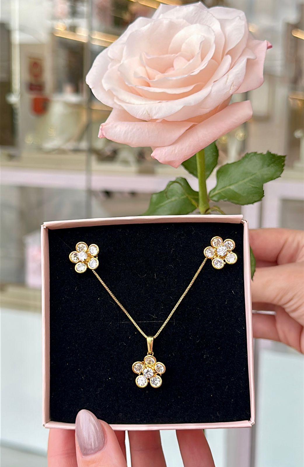 Conjunto Flor Colar e Brinco Cravejado Cristal Folheado Ouro 18k