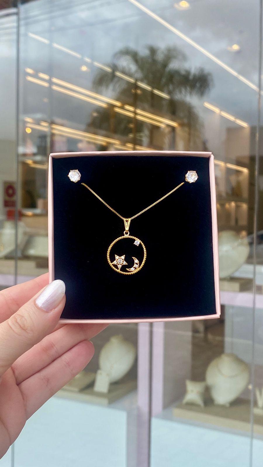 Delicado e encantador, esse conjunto traz um pingente redondo com lua e estrela cravejadas, criando um visual romântico e moderno