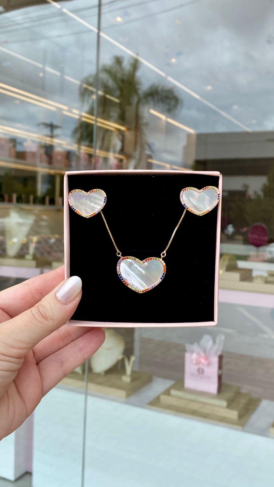 Conjunto Colar e Brincos Coração Madrepérola Folheado a Ródio