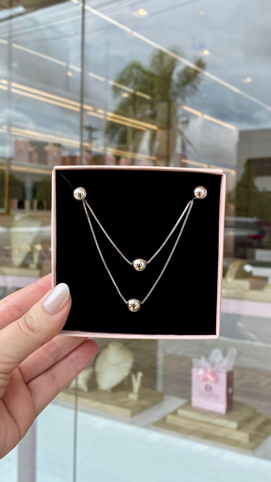 O colar duplo cria um efeito sofisticado no colo, com duas correntes em alturas diferentes e uma bolinha central em cada, trazendo equilíbrio e delicadeza