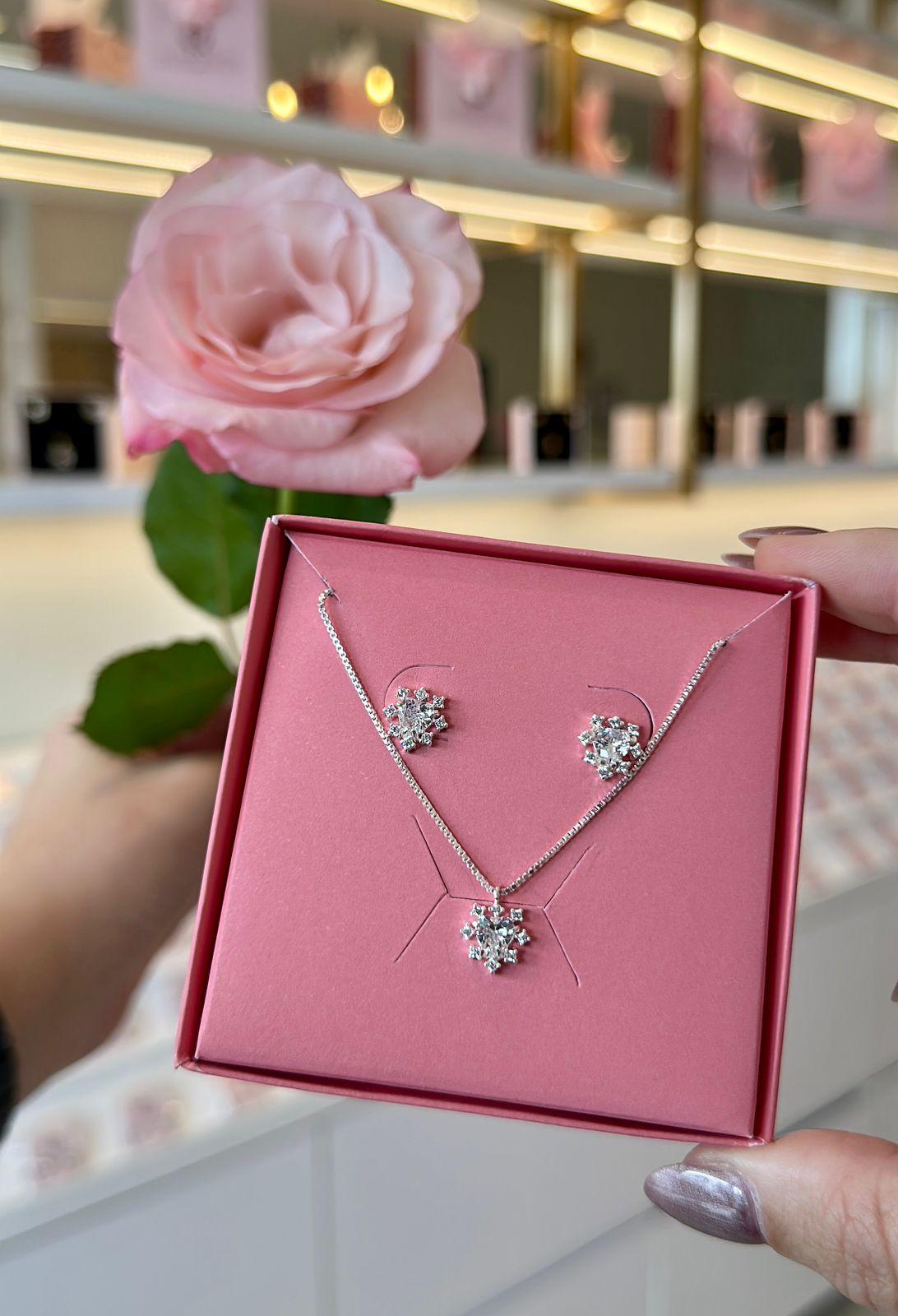 Conjunto Colar e Brinco Coração Cravejado Zircônia Cristal Prata 925