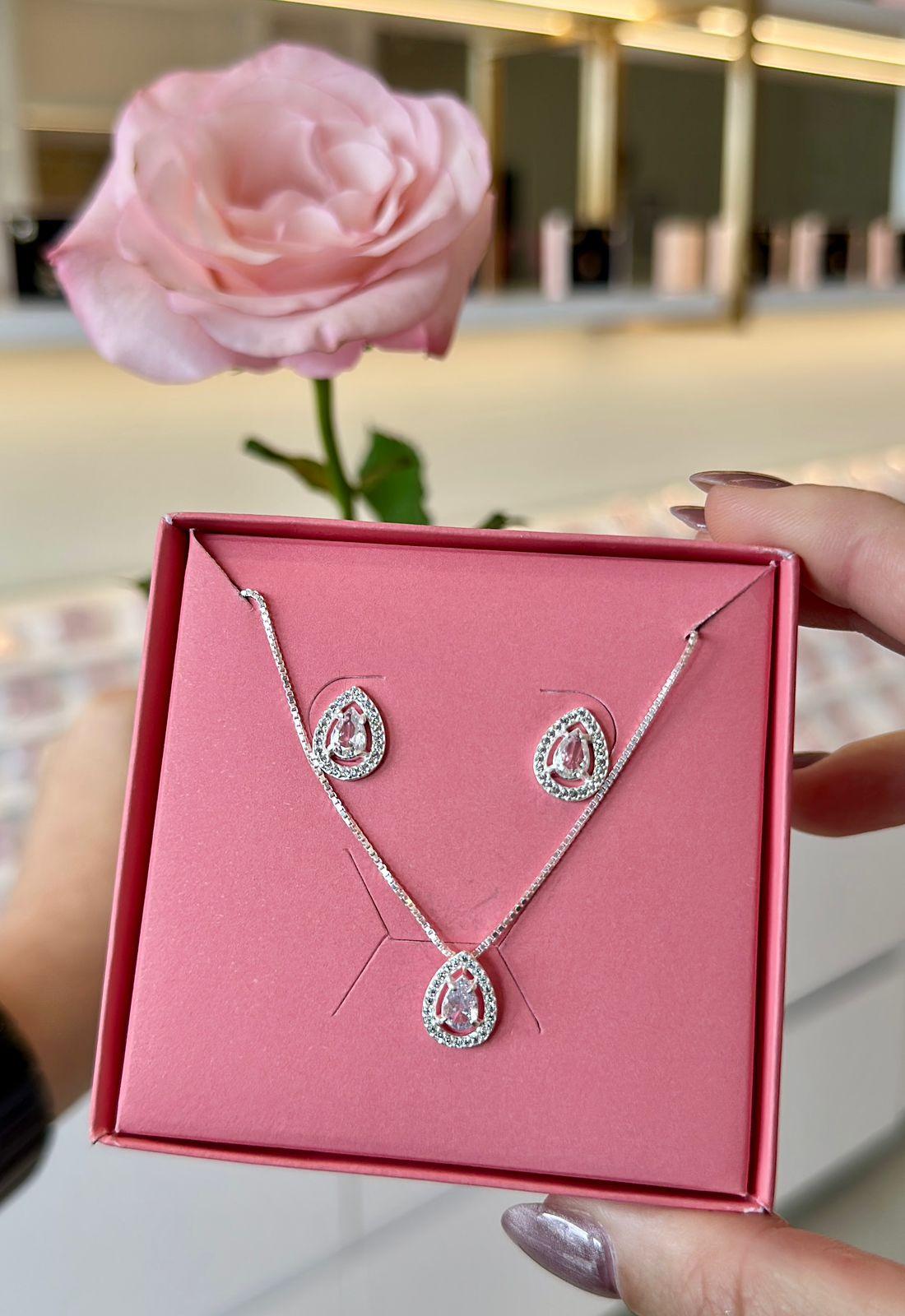 Conjunto Colar e Brinco Gota Cravejada Zircônias Cristal Prata 925