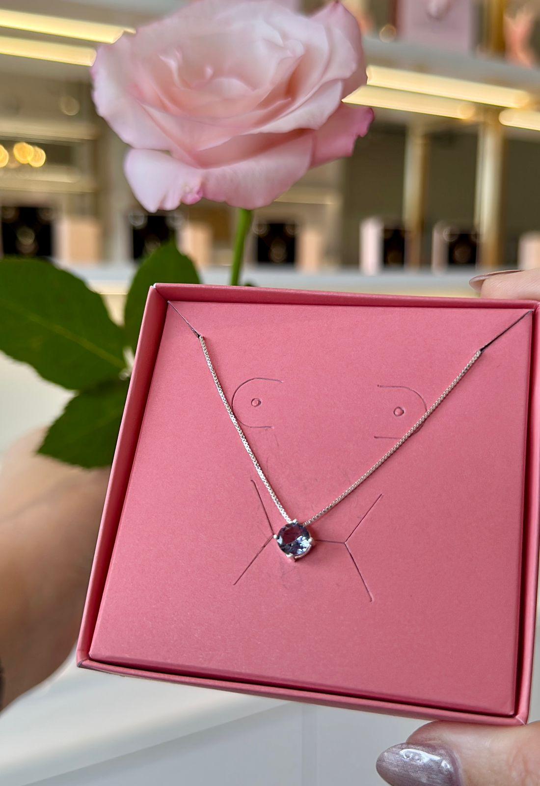 O colar ponto de luz lilás traz uma zircônia central que se destaca pelo brilho e pela cor suave, criando um visual sofisticado e feminino.