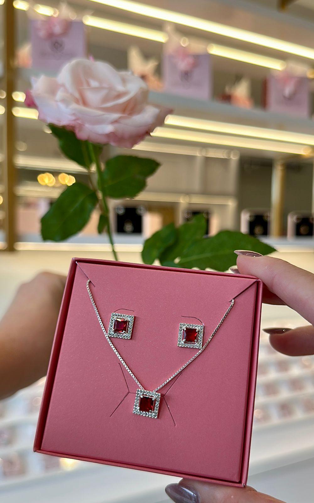Conjunto Colar e Brinco Quadrado Rubi Cravejado com Zircônias Prata 925