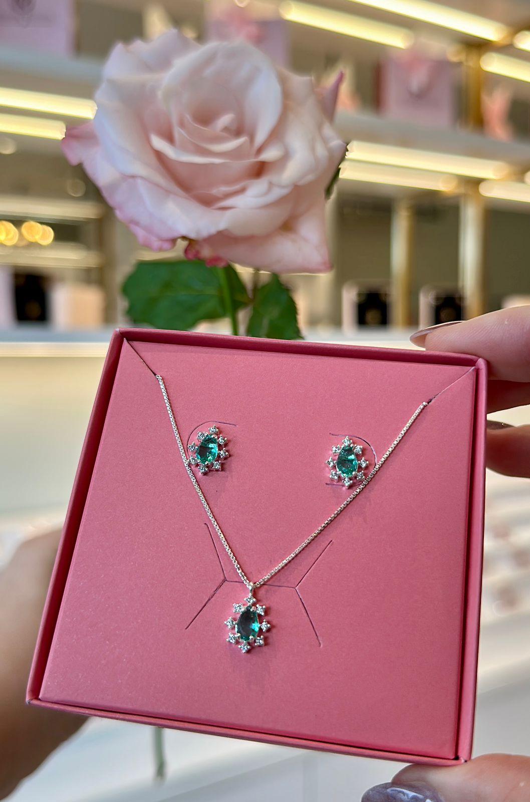 Conjunto Colar e Brinco Gota Turmalina Cravejado com Zircônias Prata 925