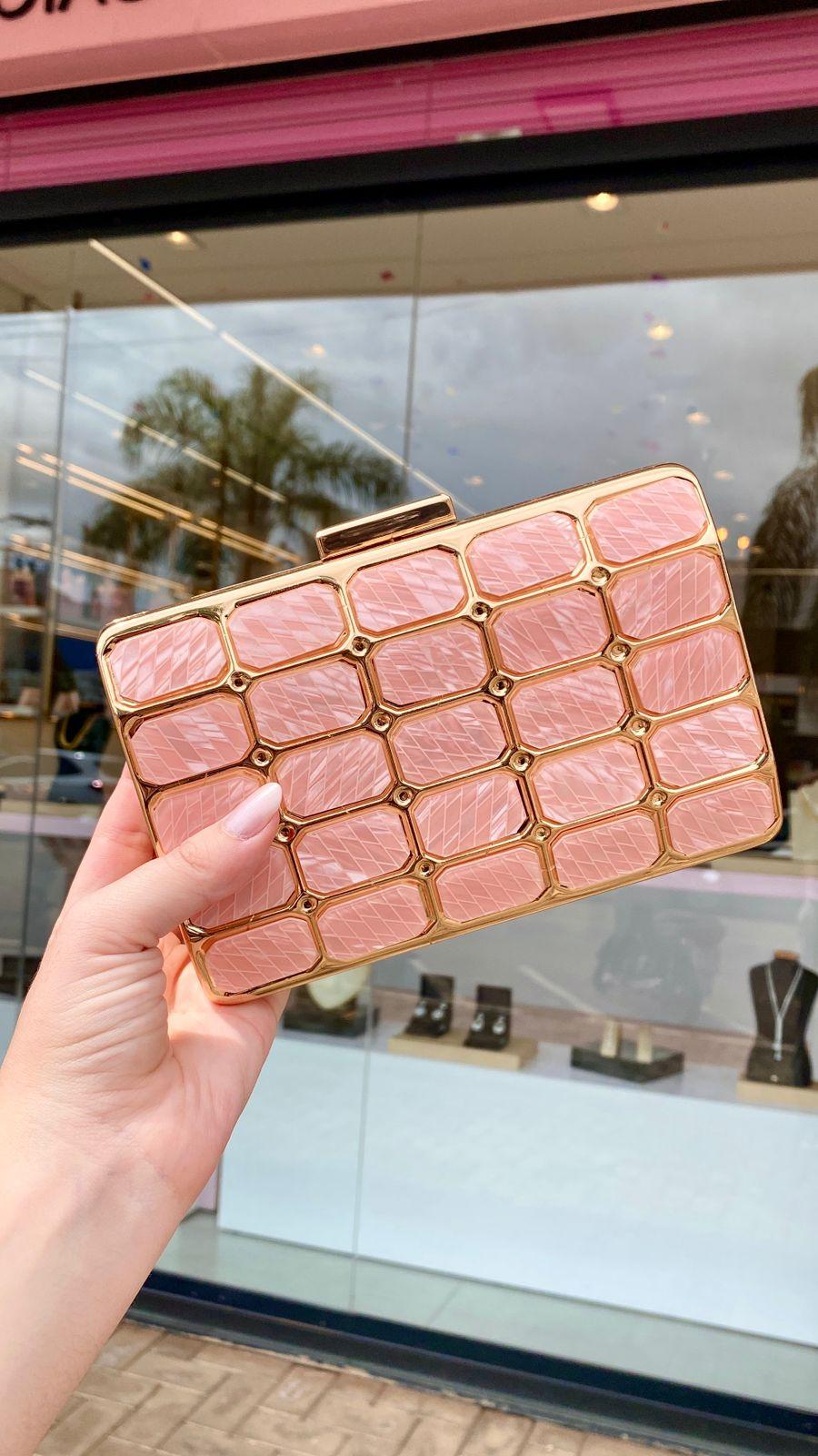 Elegante e super sofisticada, essa clutch em madrepérola rosa é perfeita para quem ama acessórios delicados e diferenciados. O design com placas de madrepérola em tom rosado e detalhes dourados cria um efeito moderno e luxuoso.