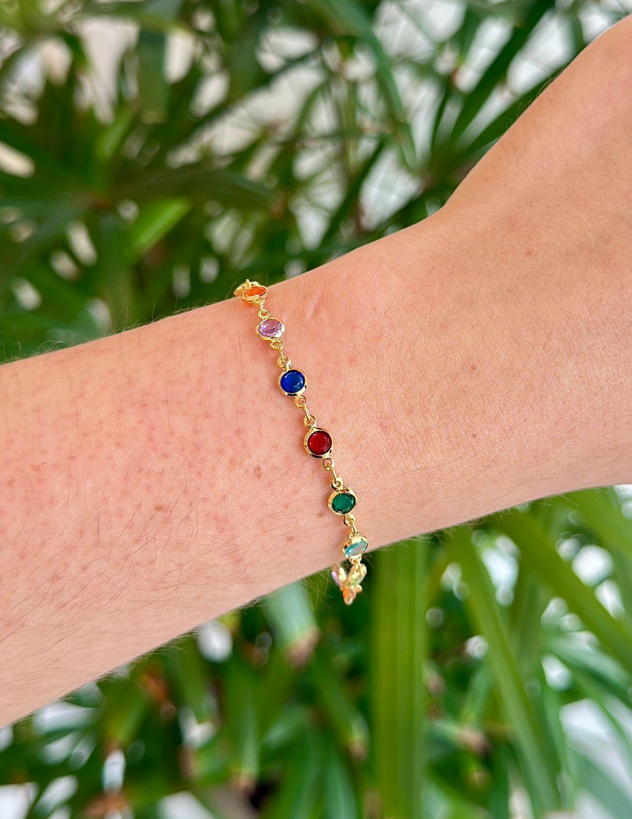 Delicada e cheia de charme, essa pulseira folheada combina bolinhas delicadas com zircônias coloridas, trazendo um toque alegre e sofisticado para a peça.