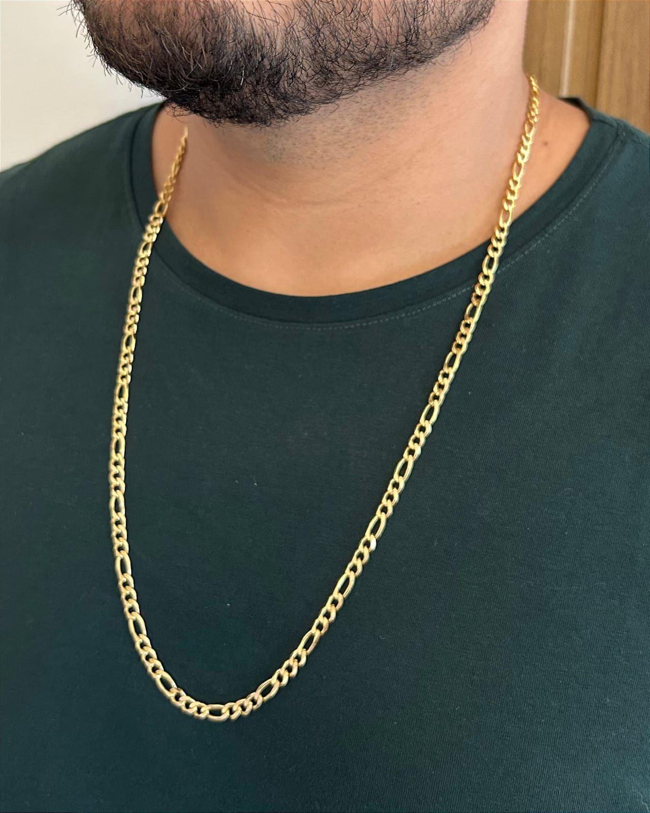 A corrente masculina elo 3x1 possui um design moderno e marcante, onde o padrão dos elos cria um visual diferenciado e cheio de personalidade. Produzida em aço com acabamento folheado ouro 18K, ela une resistência, brilho e sofisticação.
