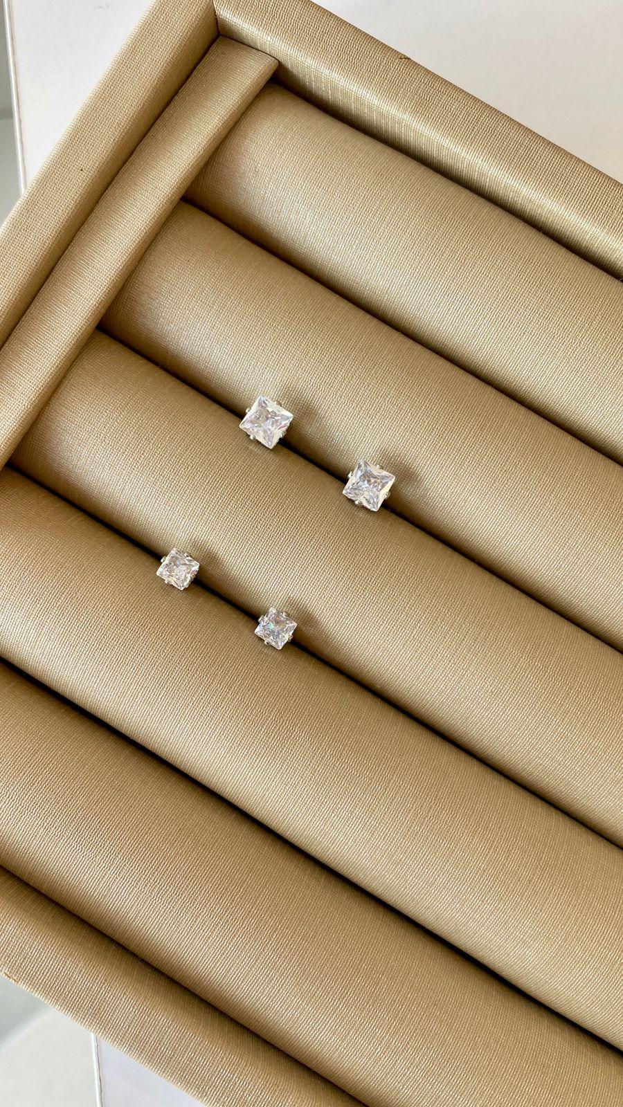 Dupla de Brincos Ponto de Luz Quadrado Ródio Branco