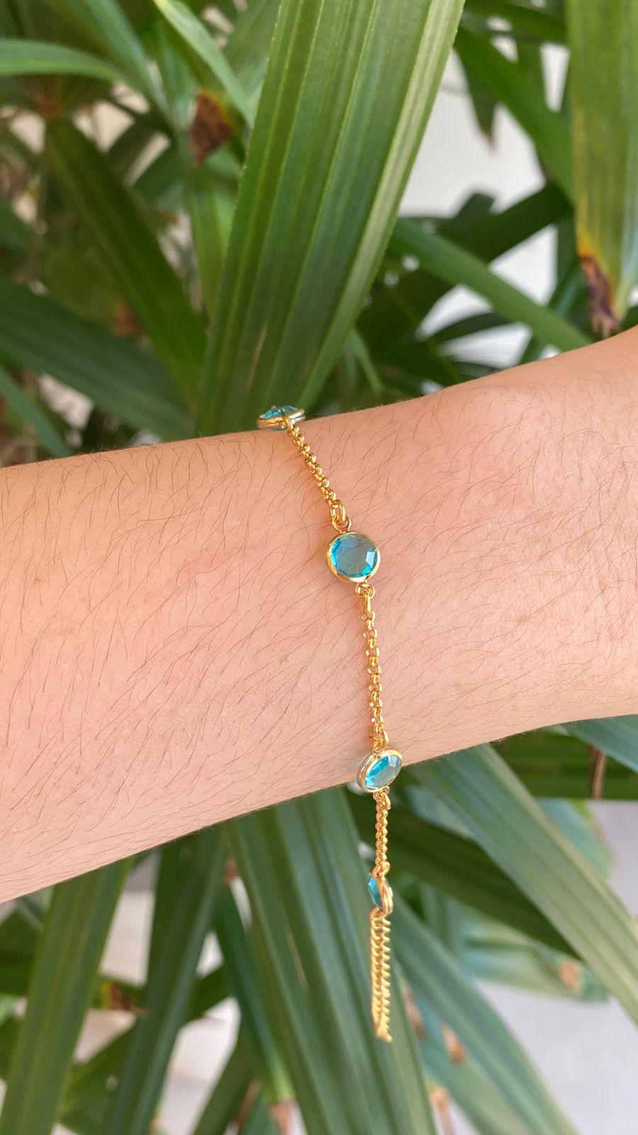 Delicada e elegante, pulseira com ponto de luz azul, folheada a ouro 18k, perfeita para iluminar o look com um toque de cor.