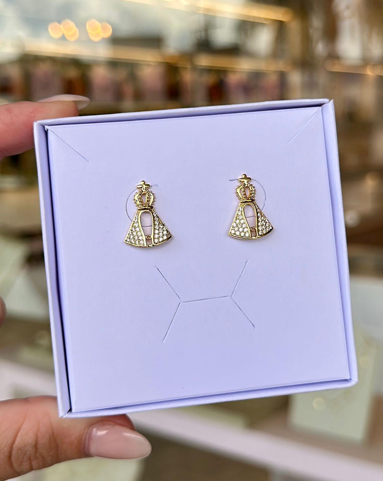 Um toque de proteção com muito brilho, brinco de Nossa Senhora com zircônia cristal, folheado a ouro 18k, leve e sofisticado.