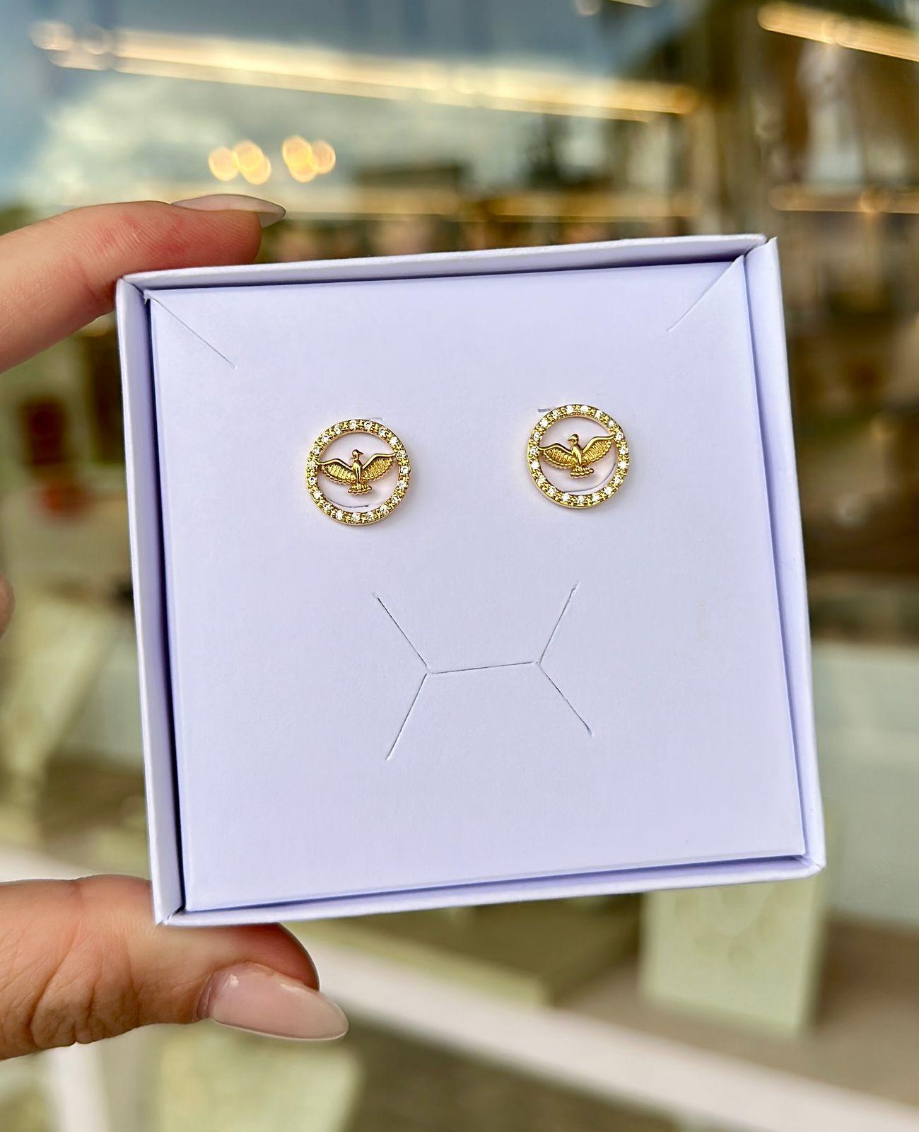 Um símbolo de proteção com muito brilho, brinco redondo do Espírito Santo cravejado, folheado ouro 18k, leve e sofisticado.