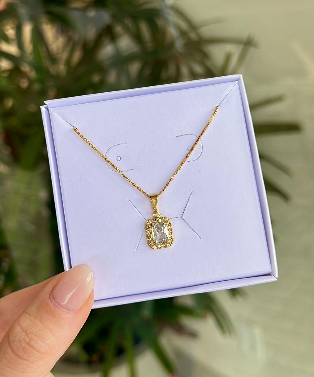 Um toque de brilho sofisticado, colar com pingente quadrado e zircônia cristal, folheado ouro 18k, ideal para qualquer ocasião.
