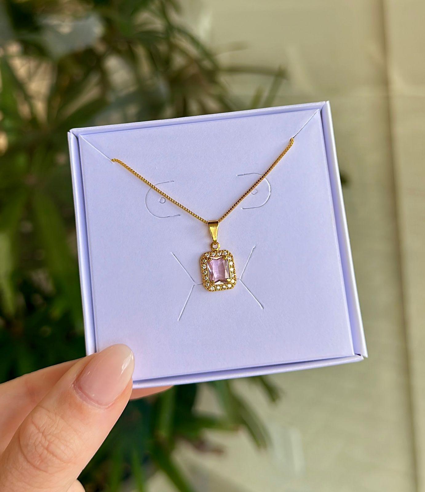 Um charme delicado e feminino, colar com pingente quadrado e zircônia rosa baby, folheado ouro 18k, leve e sofisticado.